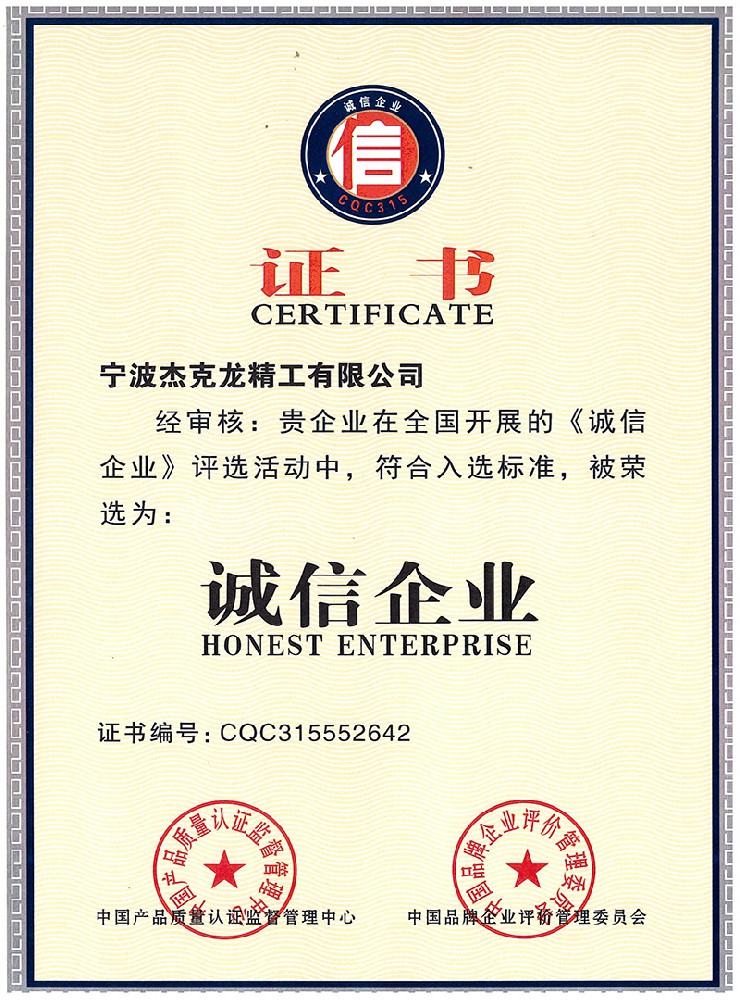 杰克龍精工先后通過了ISO9001、ISO14001和ISO45001三大管理體系認(rèn)證,杰克龍精工被認(rèn)定為“高新技術(shù)企業(yè)”。